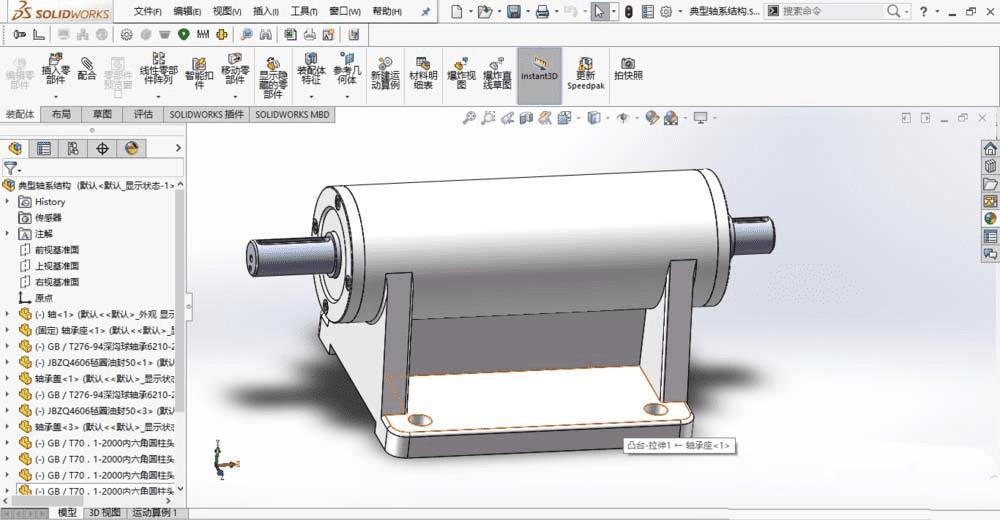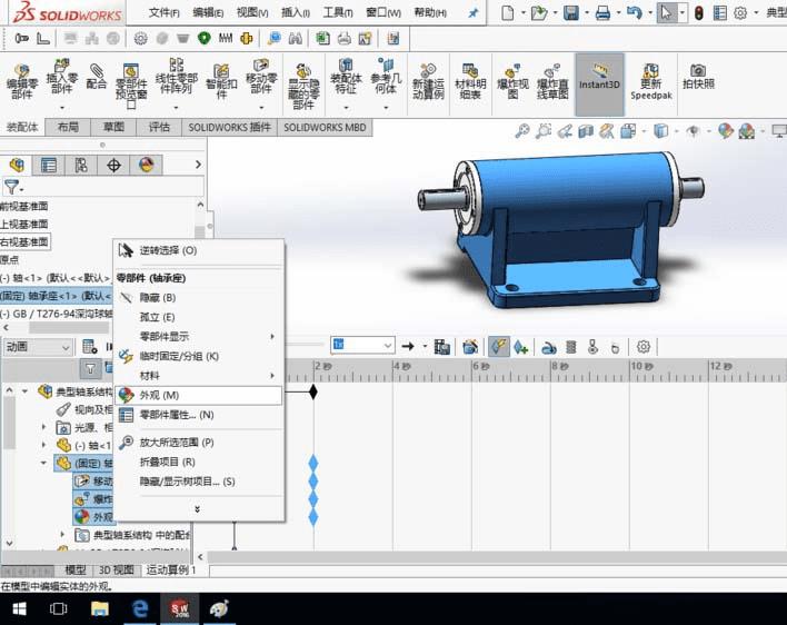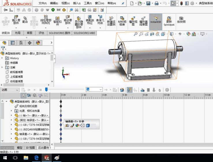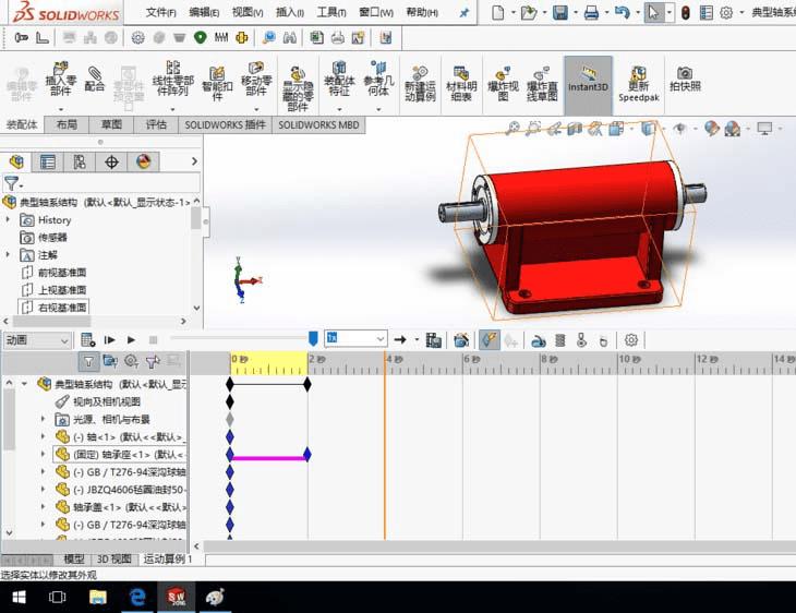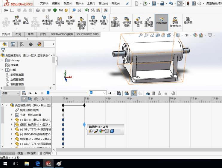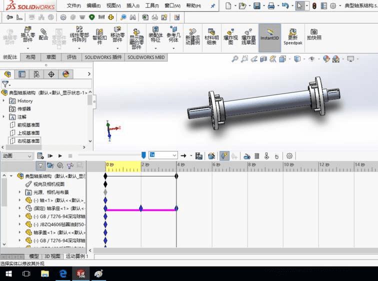 1、SolidWorks打开一个装配体模型。装配体模型任意,这里以轴系结构装配体为例,介绍在动画过程中改变零件的视图属性。