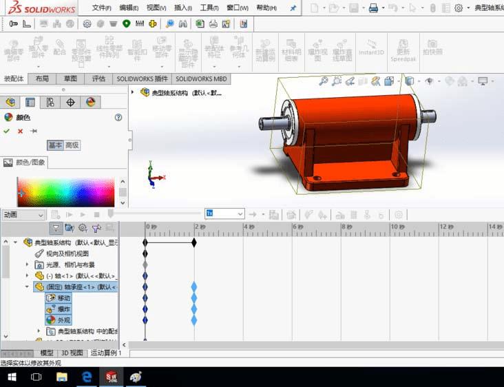 4、在“2秒”处选中轴承座零件,编辑外观。设置外观为红色,如图所示,单击确定。