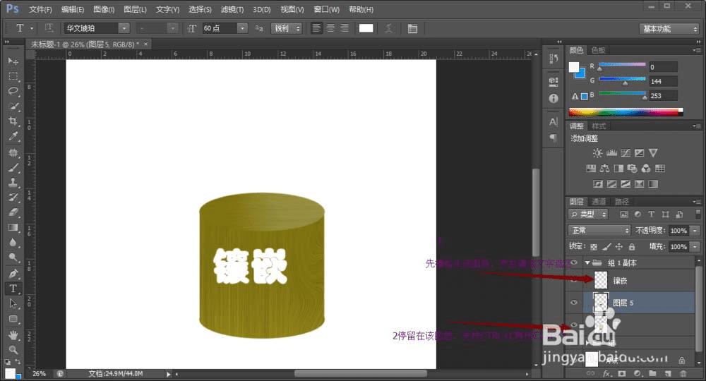 2、然后点击文字图层右键栅格化图层,然后按住CTRL点击文字图层的图标调出选区(图中第1步),然后把图层停留在你想镶嵌的图层按住CTRL+C再按cTRL+V(图中第2步),然后会生成一个图层,如图中的图层5,然后把原来的文字图层关闭