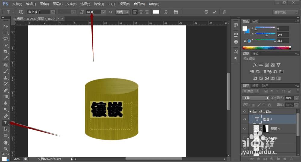 1、先打开你要镶嵌的东西,然后用文字工具在上面打上你想镶嵌的字,调整大小