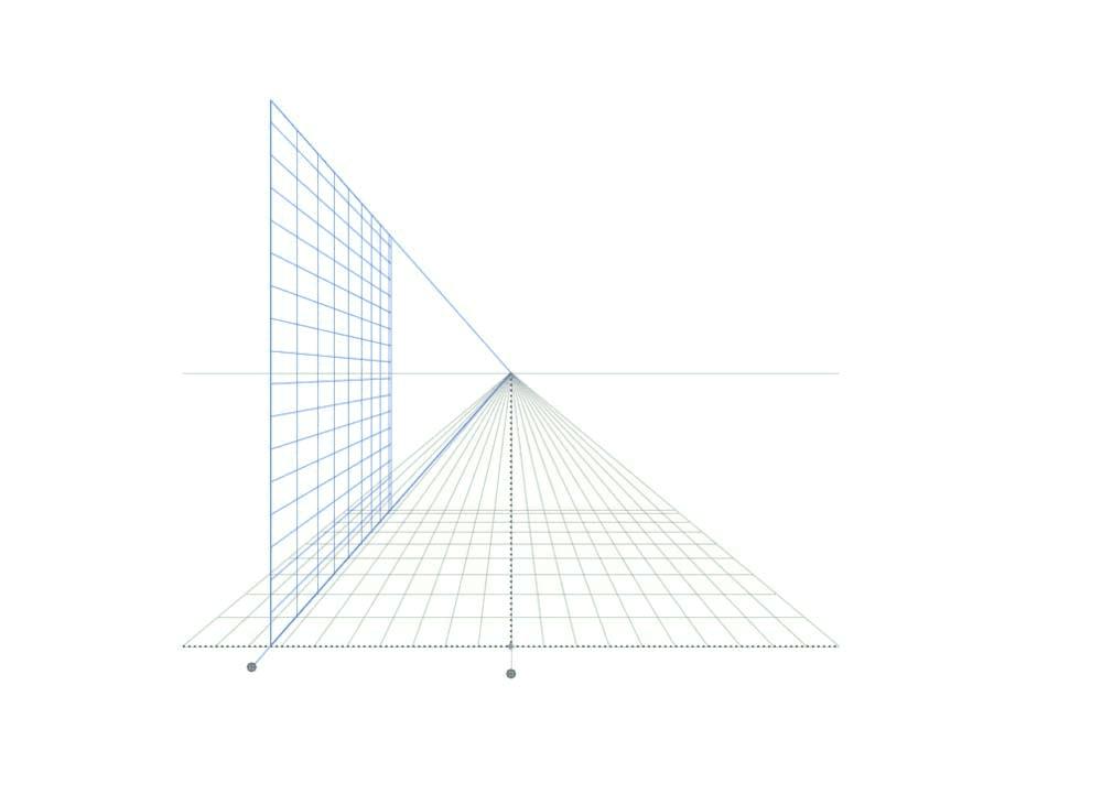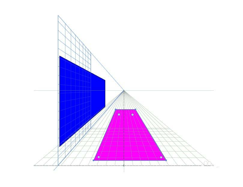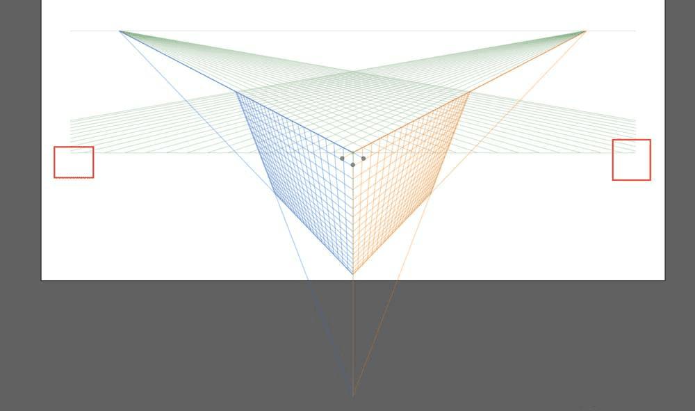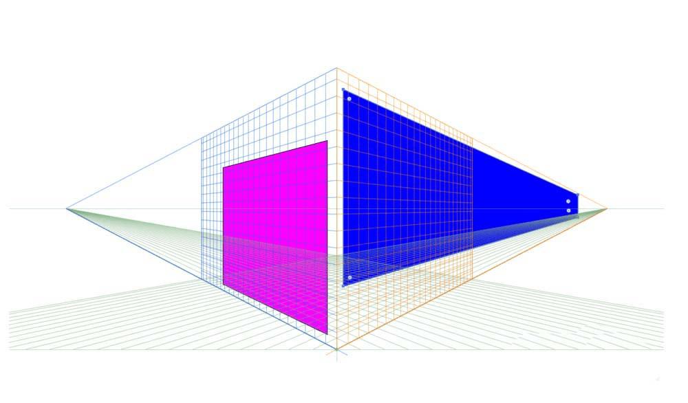 接下来看一下2点透视,这是平常常用的透视方式,同样是根据近大远小的透视原理,两个面会逐渐消失在两个点