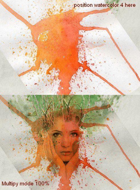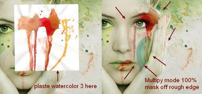 11、打开图片水彩3,做过旋转变化和大小调整后,将之移动到右眼区域,将混合模式设置为 正片叠底100%,使用图层模板,以获得褪色效果。