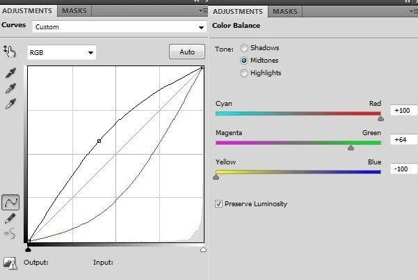 12、我将会使用曲线和色彩平衡调整图层(勾选 使用前一图层剪切蒙版)来调整前一步中的水彩效果。
