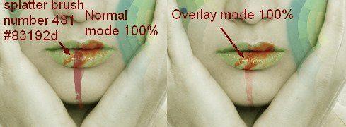 10、再新建一个图层,使用第481号飞溅笔刷在嘴唇和下巴上画一笔,颜色为#83192d,将其混合模式设置为叠加100%。