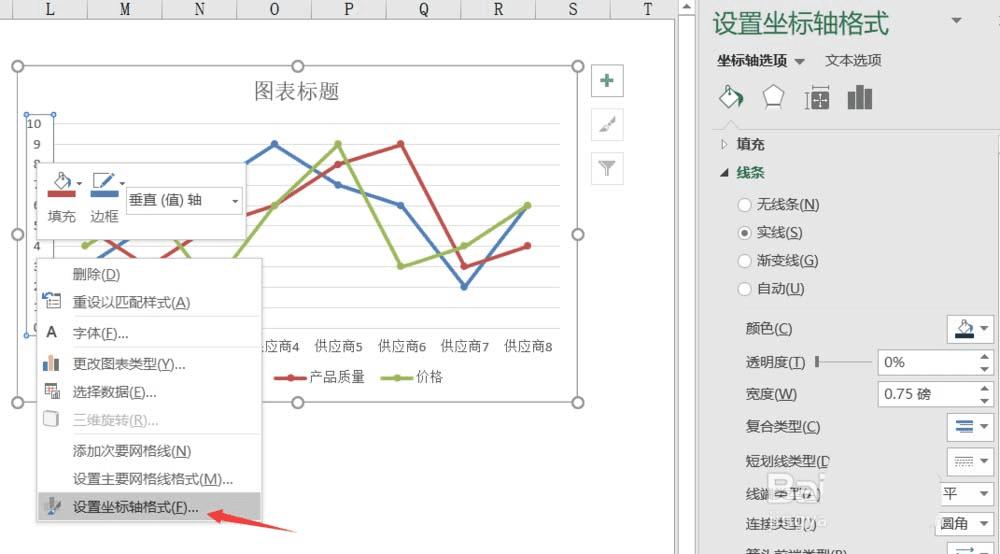 3、将横纵坐标轴设为实线,如图,右键单击横(纵)坐标轴数据,单击选项栏中“设置坐标轴格式”,右侧弹出设置区域,如图单击线条——实线。即可,纵轴同理即可。