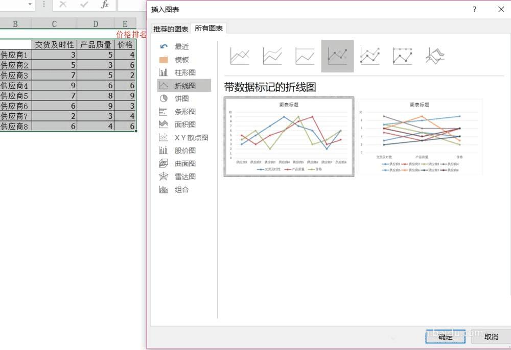 2、单击插入图表,选择插入折线图(不要以为错误,这是为了画出带有辐射线的雷达图),单击确定。