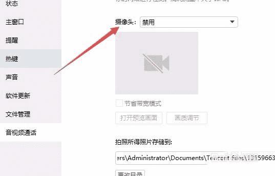 4、在右侧窗口中可以看到摄像头设置项,发现现在的设置为禁用。