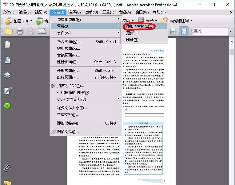 2、在菜单中选择“文档-背景-添加/替换”给pdf文件添加背景;