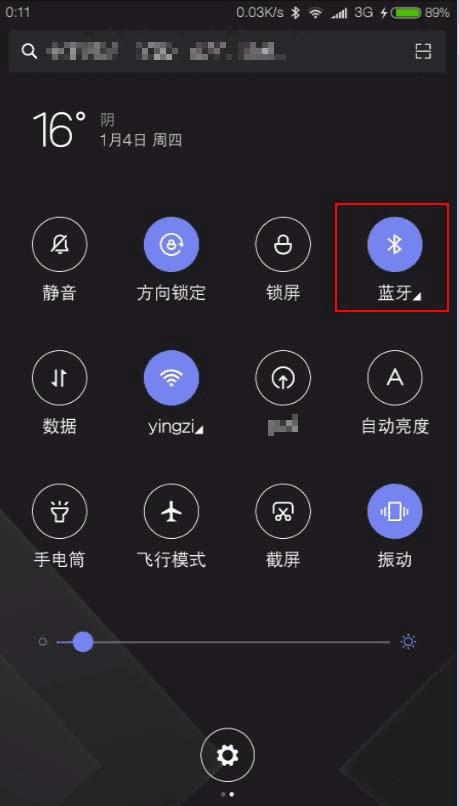 4、把蓝牙耳机跟充电线相连保持充电状态,然后按住蓝牙开关,让灯闪速三次。下拉手指通知栏长按蓝牙图标。