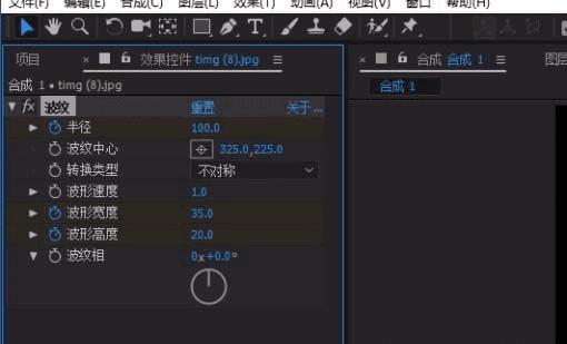 6、将时间线设置在素材起始端,按照图中的参数设置波纹效果。