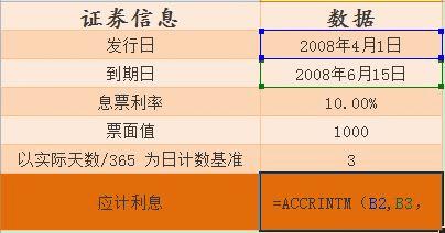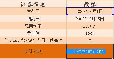 第四步,设定有价证券的年息票利率,输入“=ACCRINTM(B2,B3,B4,”;