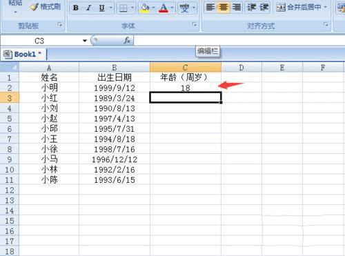 输入完成后按【Enter】键会出现【B2】的年龄,并且会自动跳转到【C3】单元格