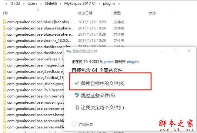 4、找到myeclipse的安装目录,打开plugins文件夹,将patch文件夹里的文件全部复制到该目录下