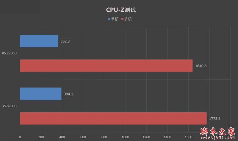 在最新版CPU-Z 1.8.2单核性能测试中锐龙5 2500U为362.3,多核性能为1640.8,而酷睿i5-8250U单核性能为394.1,多核性能为1773.3。锐龙5 2500U单/多核均弱于酷睿i5-8250U 8%。