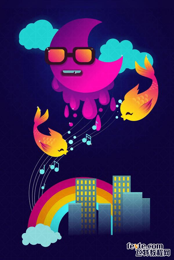 在这篇教程中,我们将绘制一个狂野,超现实的炫彩卡通海报。这个海报由月亮、飞鱼、彩虹和城市组成。主要通过结合简单的形状与喷泉填充,阴影变成外发光,混合工具,自定义图案填充,各种混合模式和其他绘图工具,形成一个适合黑灯海报的时髦,新鲜的设计。本教程鼓励您将所有想法融合到一个内聚设计中。好了,话不多说,下面让我们一起去看看具体的海报设计过程吧!