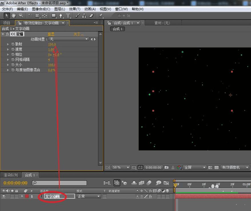3、选择“文本图层”,在CC 星爆效果,调整“散射”参数为150,以使画面上的星点散射的范围更大。
