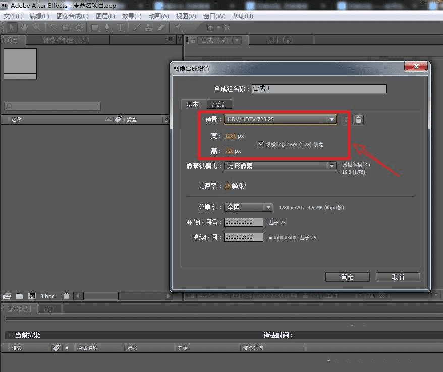 1、新建一个合成组,将预置设为:HDV/HDTV 720(持续时间为:3秒)。