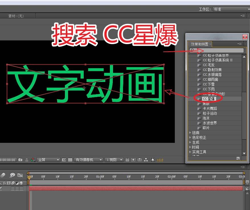 2、在“效果与预置”面板搜索 CC星爆,通过鼠标拖拽将其添加到文本层上。