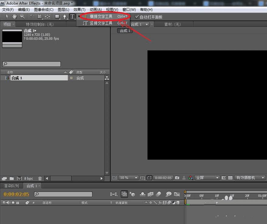 2、在我们的工具栏,长按鼠标左键选择文本工具下的横排文字工具。