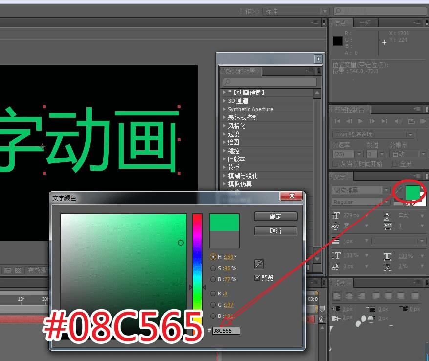 1、在“文字”面板找到文本颜色设置,将颜色设为:翠绿色(#08C565)。
