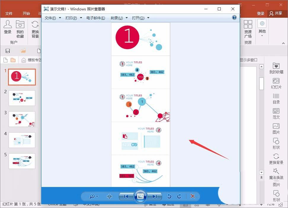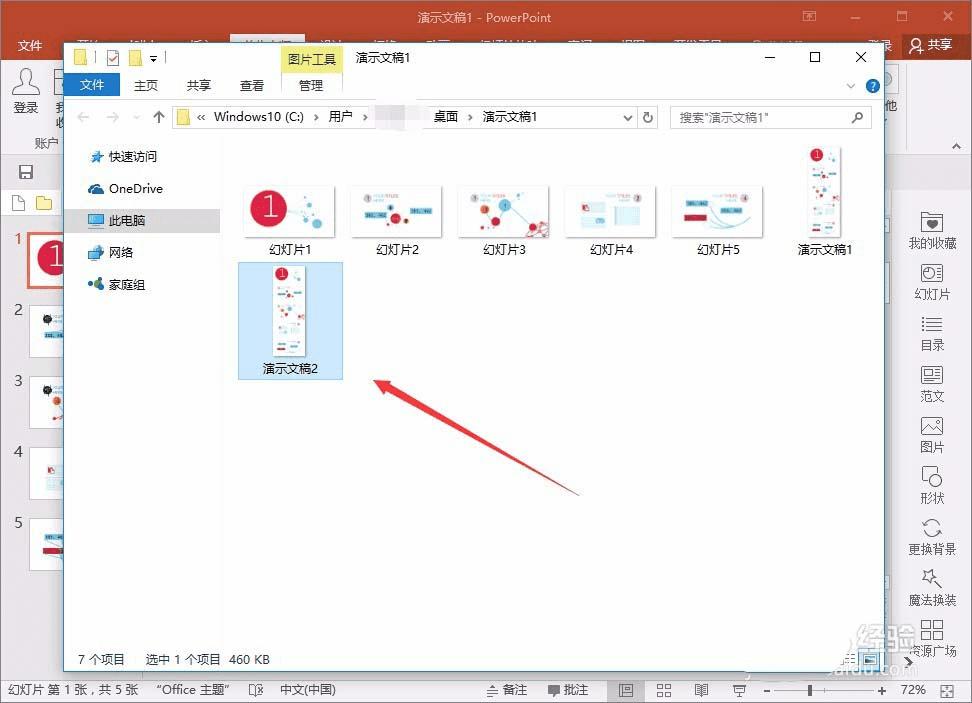 1、比如先随便找个ppt幻灯片,这里我们需要把这5个,做成一个长图片,先用比较常规的方法,以2016版本举例,操作方法为