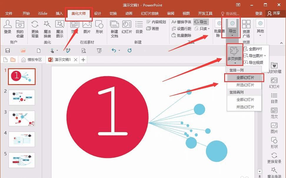 2、还是一样下载安装之后,选择导出,多页拼图,可以选择是竖排一列还是竖排两列,并且可以选择是全部幻灯片还是选择的幻灯片,所以这个功能相对强大一些。