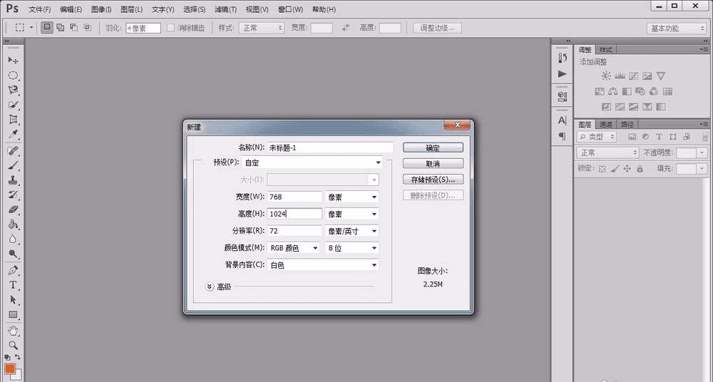 1、首先,打开photoshop软件,新建一个白色画布。