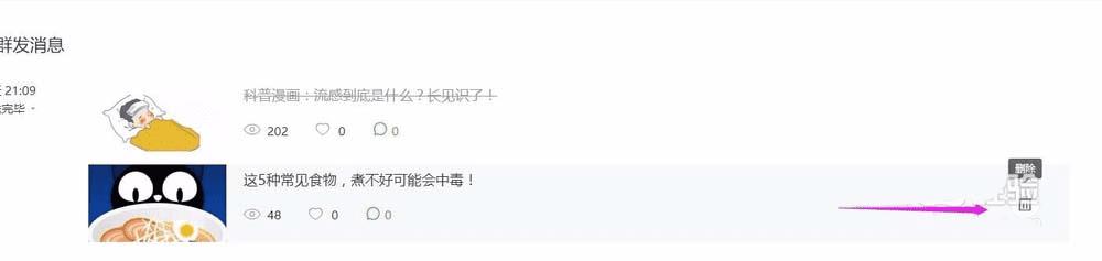 5、点击左上角的微信公众号,之后下拉找到已群发消息,之后点击右侧的删除图标将其删除