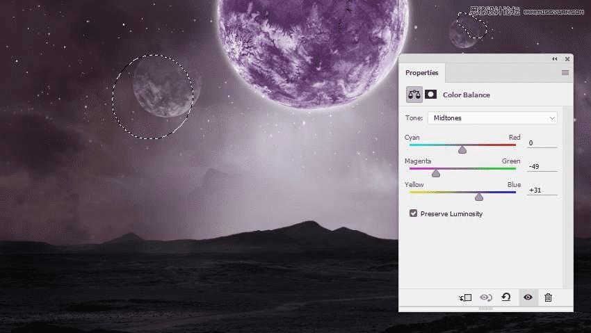 制作一个色彩平衡调整图层来改变行星的颜色。在图层蒙版上,使用柔软的黑色画笔减少对小行星的洋红色效果。