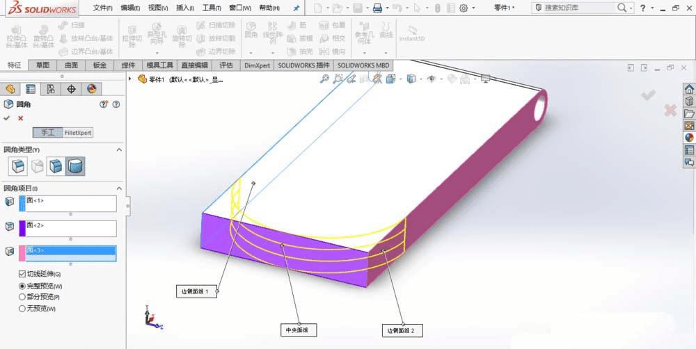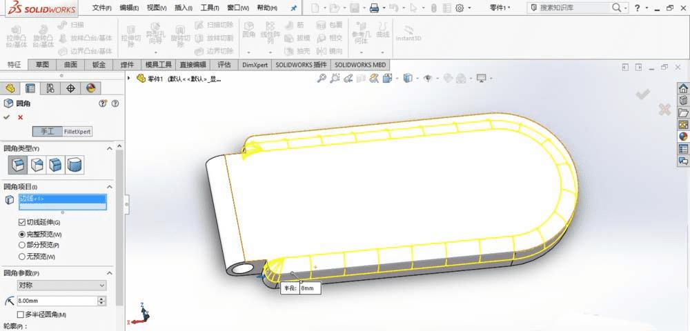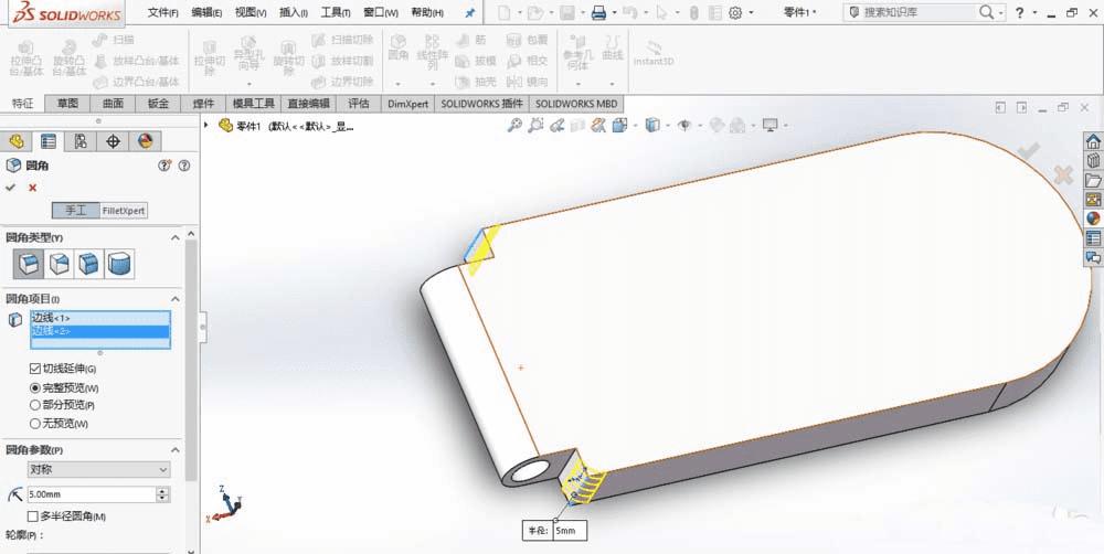 4、创建圆角2,半径为“5 mm”,如图所示。创建圆角3,半径为“8 mm”,如图所示。