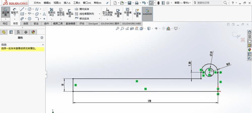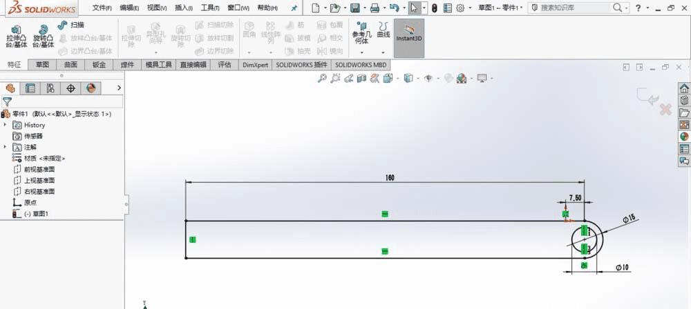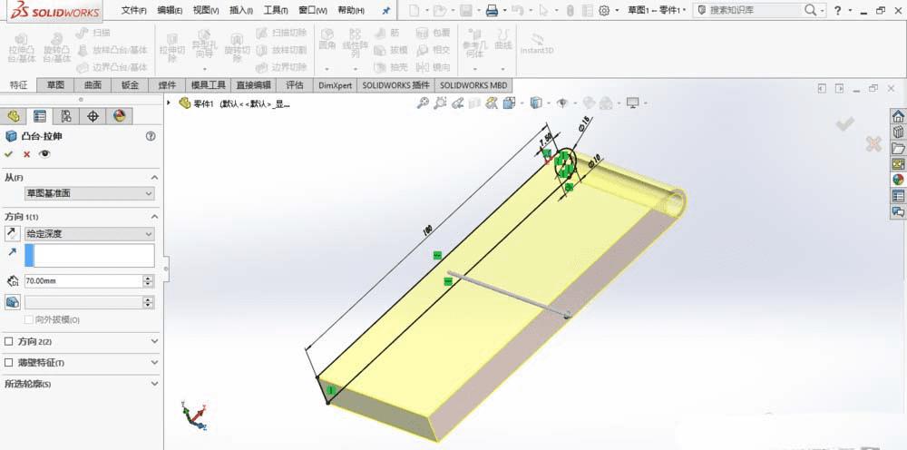 1、打开SolidWorks,新建一个零件模型。在前视基准面上绘制草图,创建拉伸特征,如图所示。