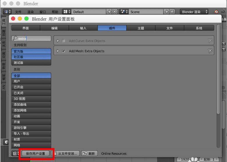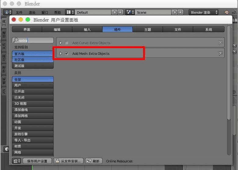 3、在“插件”中找到“Add Mesh:Extra Objects”,并勾选启用。