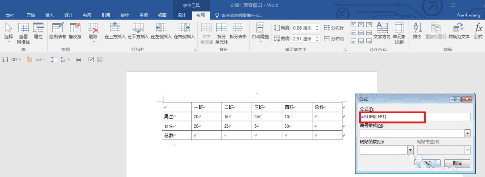7、将光标定位到下方的单元格,点击公式,word会智能识别sum的参数是above,如下图。