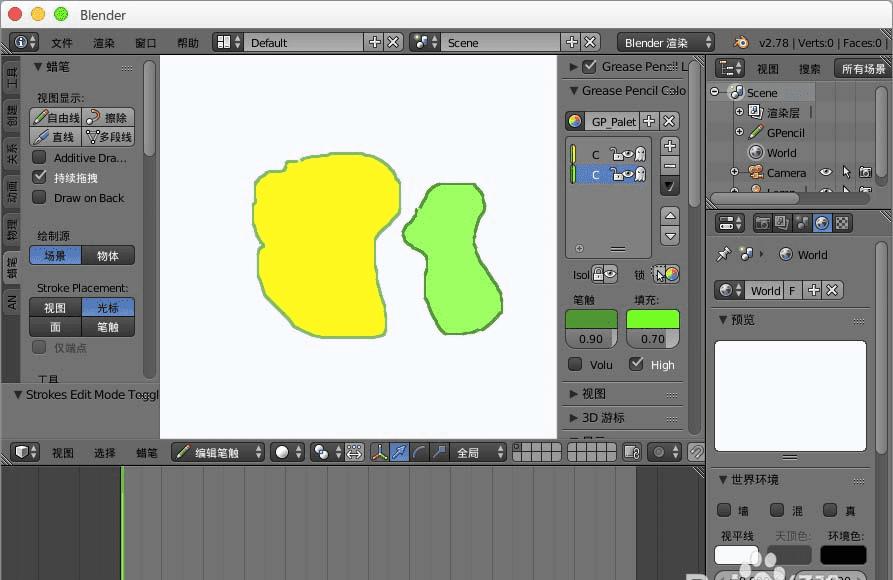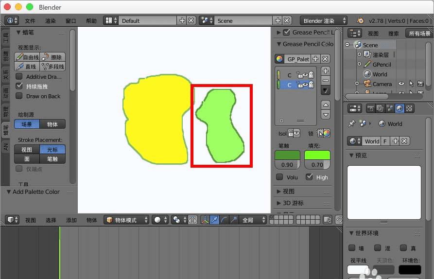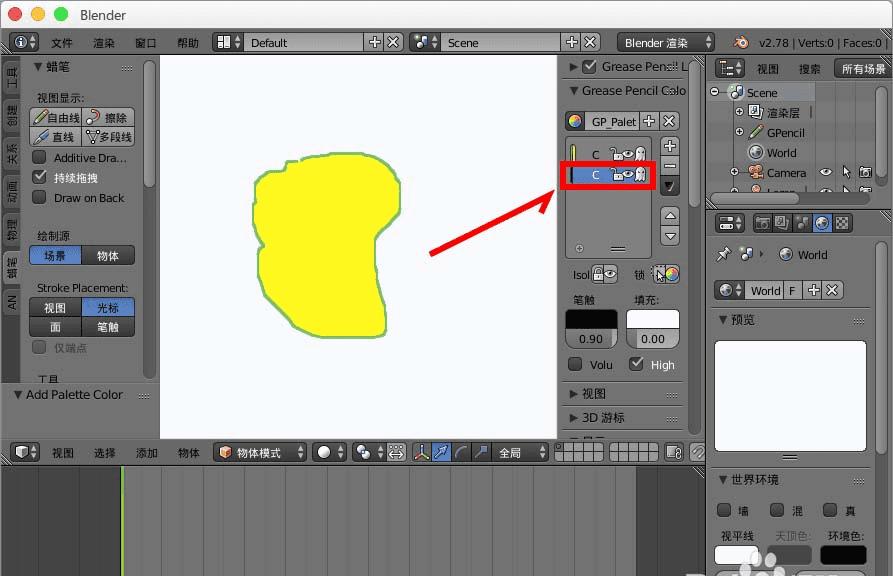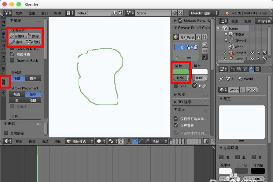 4、左边切换到“蜡笔”我们可以选择绘制的线,或者直接按住“D”键,鼠标左键进行绘制,右边的面板上可以设置笔触的颜色。