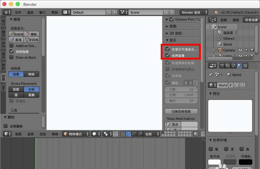 3、按“n”键调出3d视图右边属性面板,勾选显示里面的“仅显示可渲染元素”与“世界背景”。