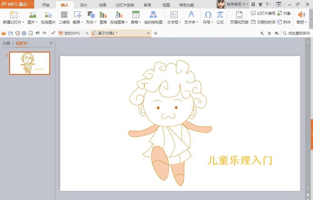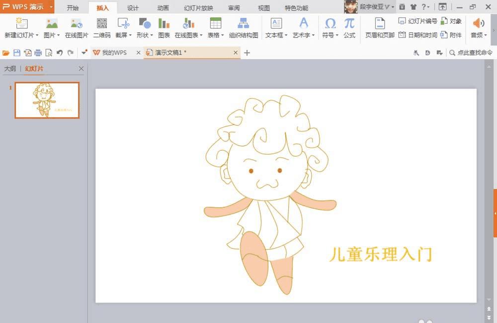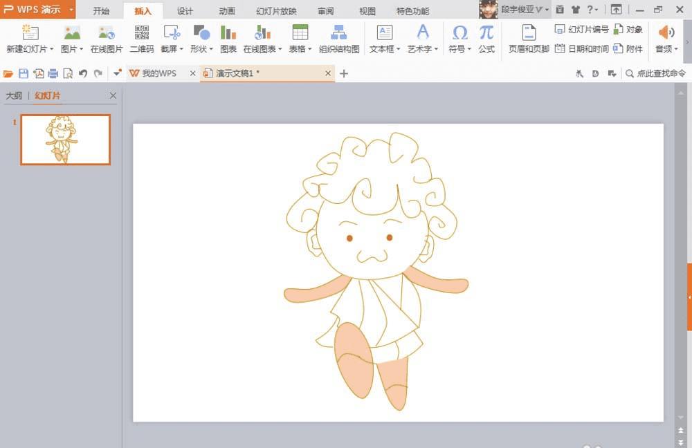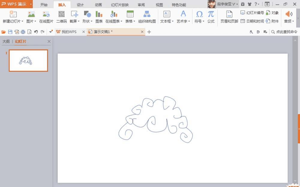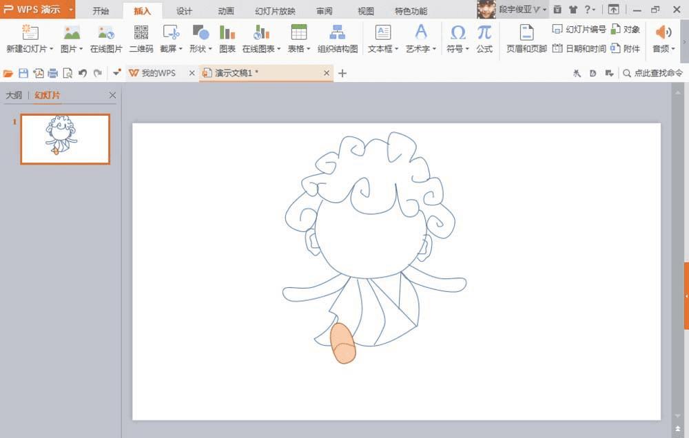 2、选择插入选项,选择S形状,自动绘制人物的头发,设置轮廓的颜色为蓝色,S形状可以自动的编辑形状的顶点,调整形状的节点来修整人物的图形。