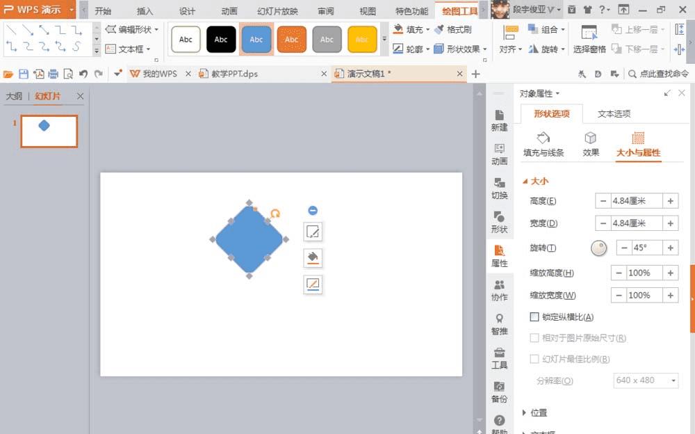 4、按下ctrl+shift键,绘制圆形矩形,转变为正圆角,在工具栏的上方,会自动有填充为蓝色的圆角矩形,选中即可,轮廓设置为无,然后角度设置为45度。或者是点选圆角矩形,可以随意按下鼠标左键旋转变形。