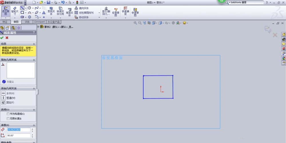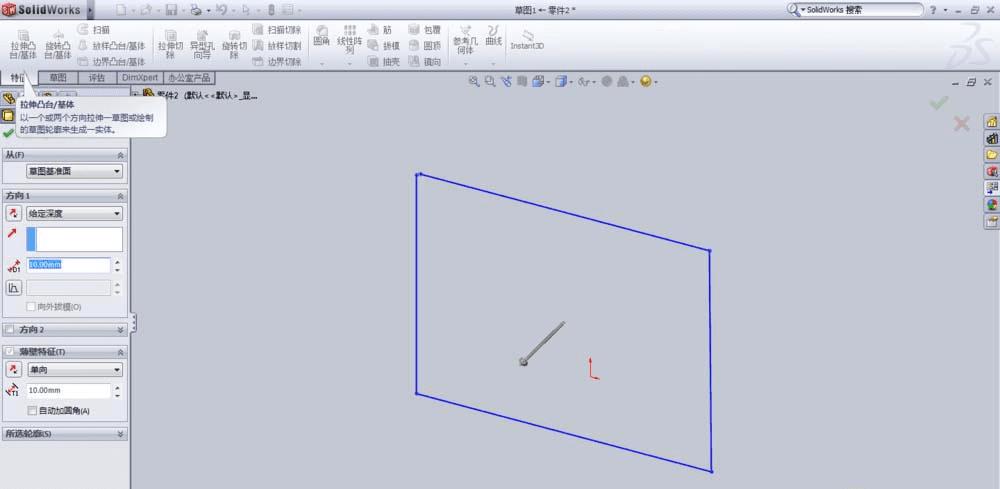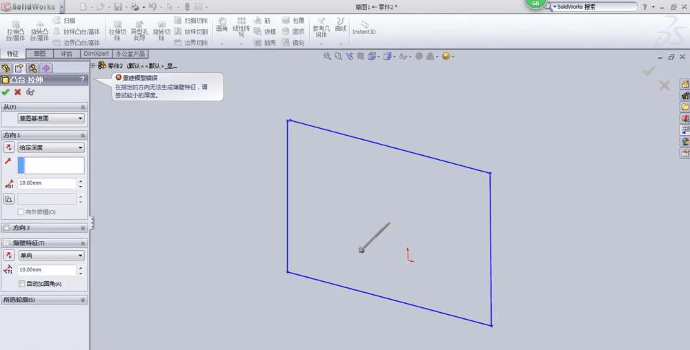 4、点击特征—拉伸凸台,会进入下面的画面。当我们选择好参数,点击确定时,会出现图中出现的错误信息。
