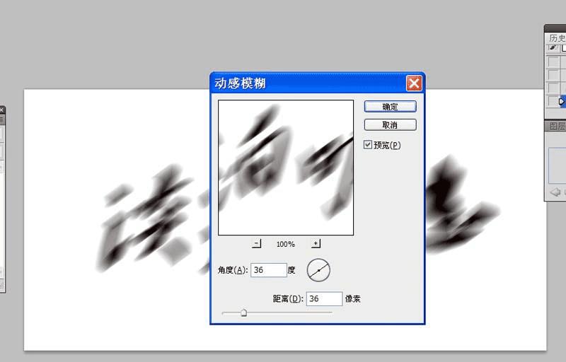 4、执行滤镜-模糊-动感模糊命令,设置角度和距离均为36,点击确定按钮。