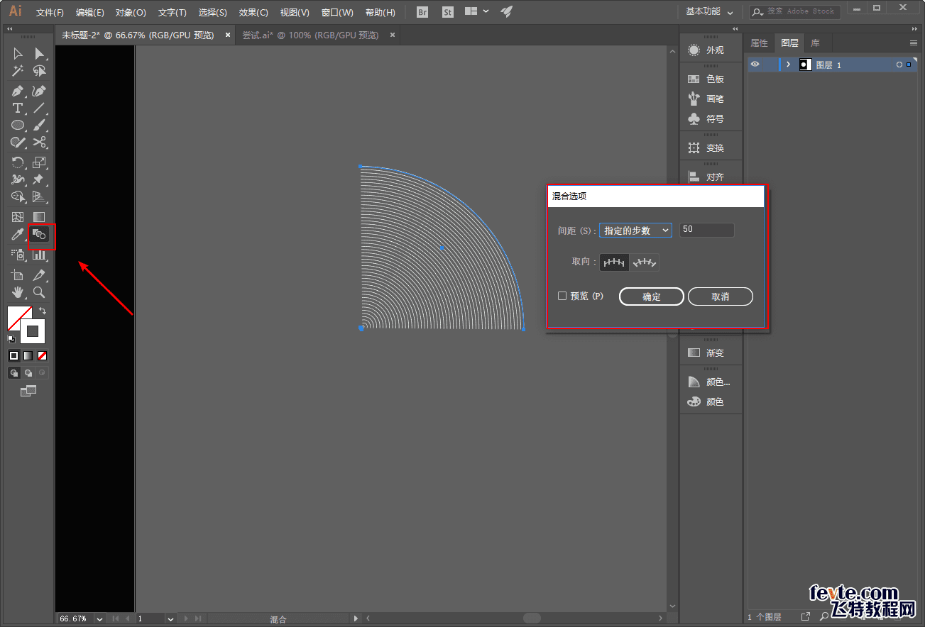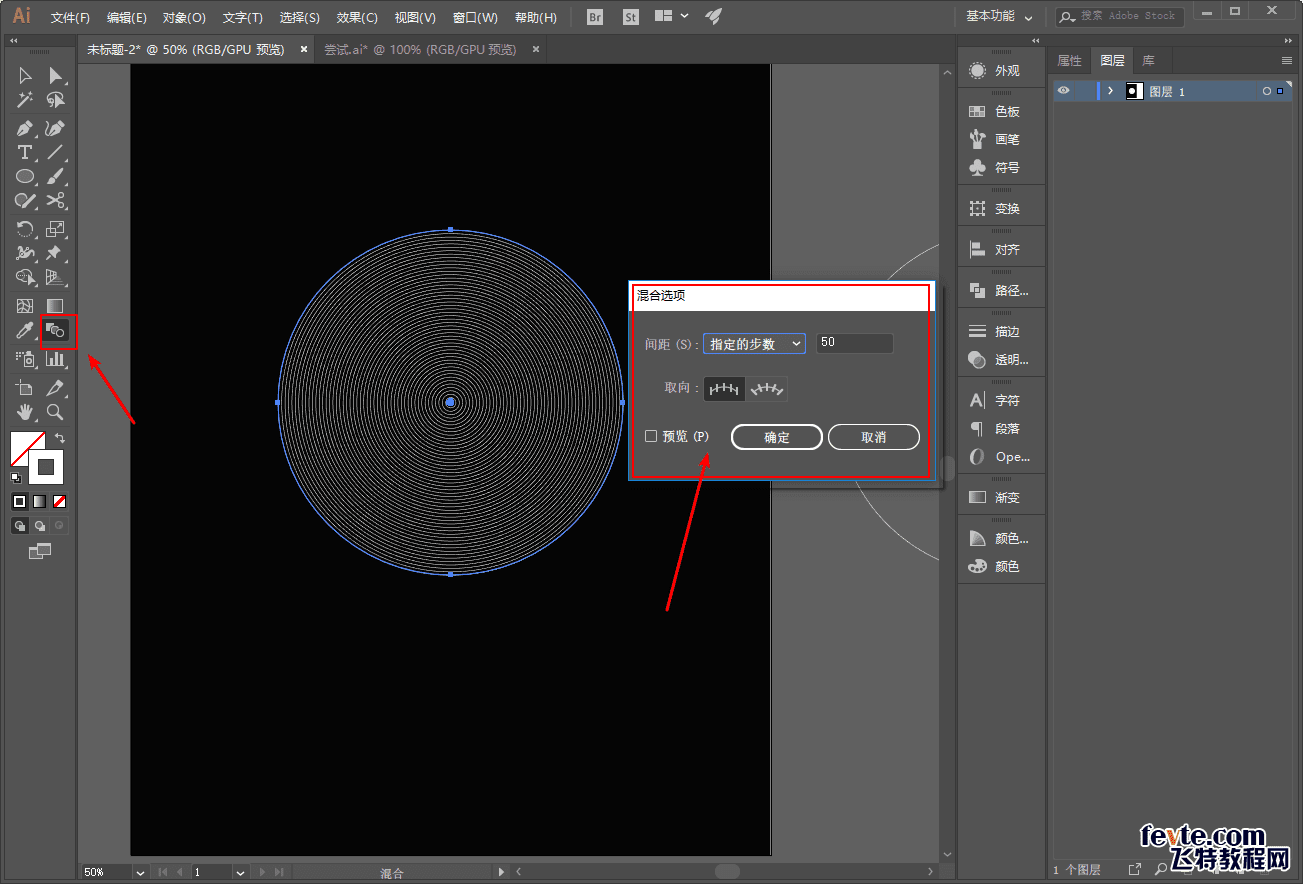 用混合工具先将第一组的两个圆进行混合,步数大家看着办吧,我这里设置的是50步: