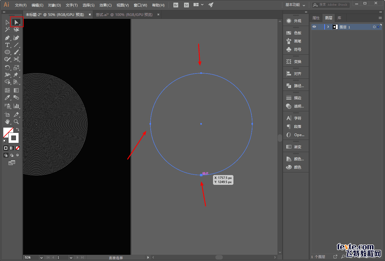然后对另外一组圆进行操作,用小白工具选中红色箭头处的锚点进行删除: