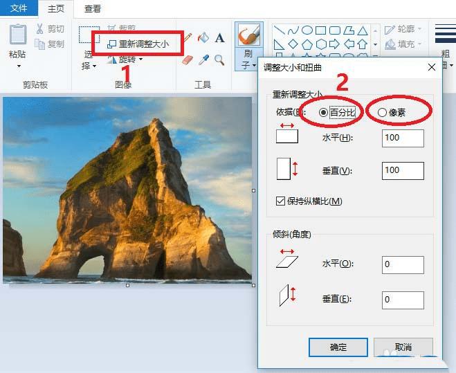 2、在画图界面选择“重新调整大小”,然后有“百分比”和“像素”,一般我们会选用像素来改变图片像素。