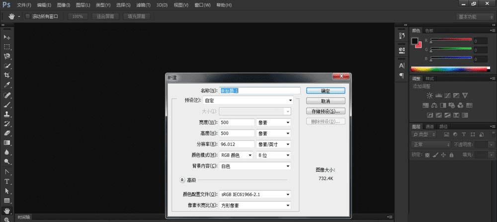 1、打开ps,新建画布 500*500 当然 也可以根据自己需求来建,单击确定按钮。