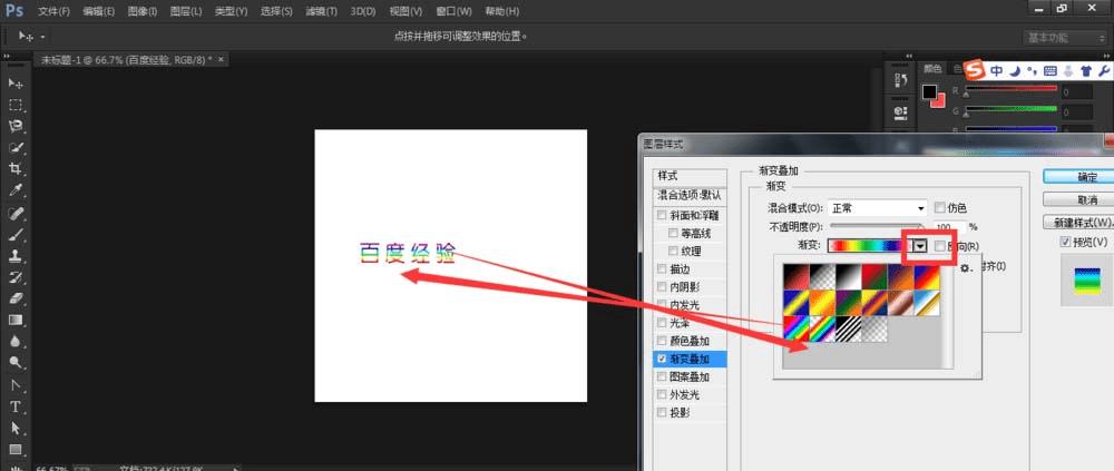 3、选择文字图层下面的fx,设置图层样式,渐变。参数设置如下图。