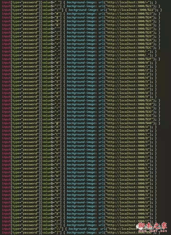使用express创建服务器,监听3000端口,只要请求http://localhost:3000/:key,就能输出key的值,就能在服务器上记录输入的值。所以只要在每输入一个值都匹配,然后通过 background-image 去请求一个已经准备好的接口,就能记录用户的输入。类似的方法记录用户的内容的CSS代码@font-face {