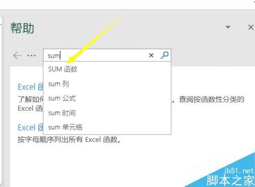 在函数帮助页面输入我们希望查看的函数说明,例如我输入SUM这个函数。