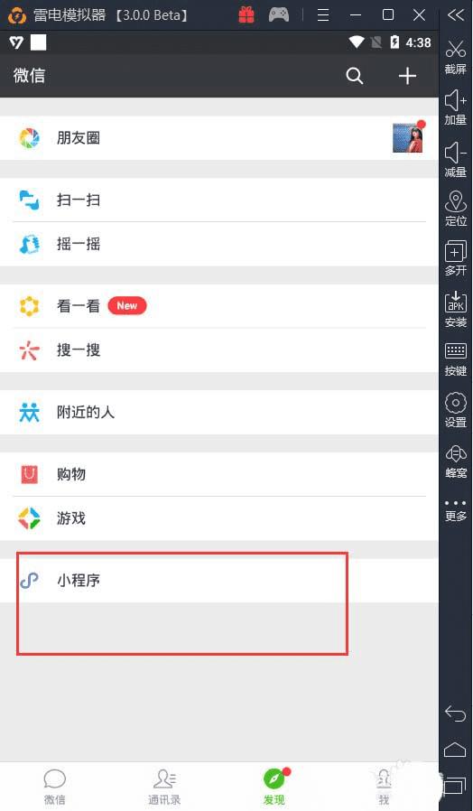 1、下载安装成功后,打开模拟器,进入“发现”打开“小程序”