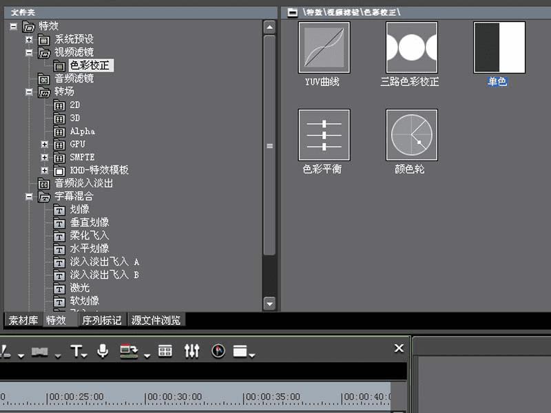 3、从特效库中找到视频滤镜选项,接着选择色彩校正,从左边找到单色选项。