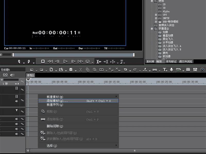 1、首先启动edius6,新建一工程,进入主界面后,右键单击va轨道,从下拉菜单中选择添加素材选项。