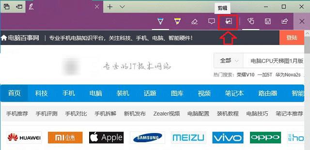 首先在Win10系统中,打开自带的Edge浏览器,然后打开需要长截屏的网页,这里以“电脑百事网”首页为例。打开网页后,点击Edge浏览器右上角的“钢笔”工具,如下图所示。